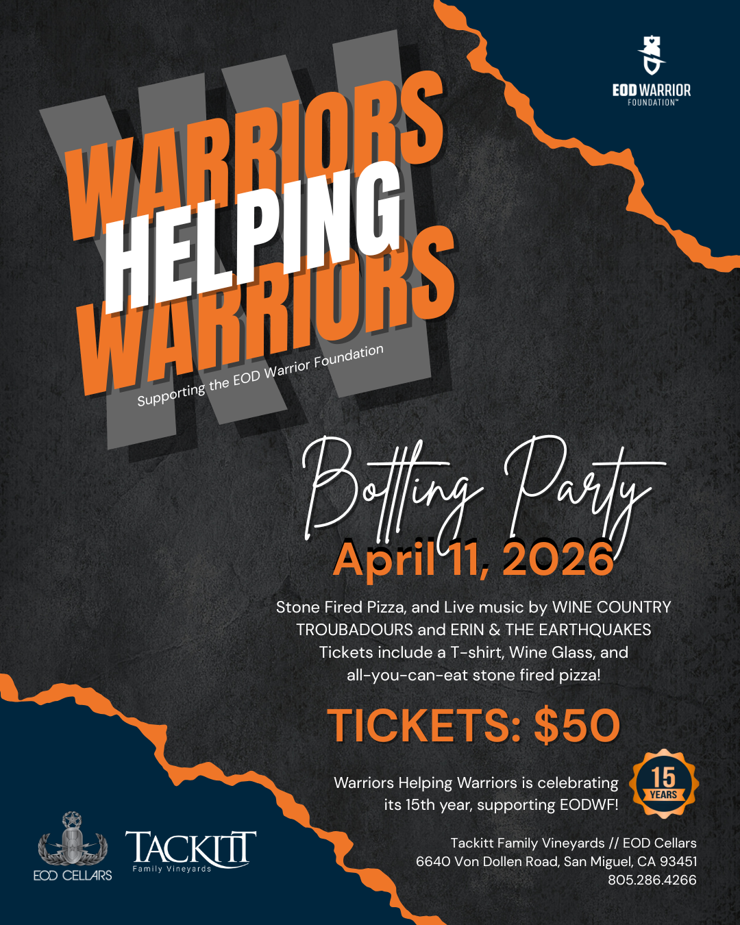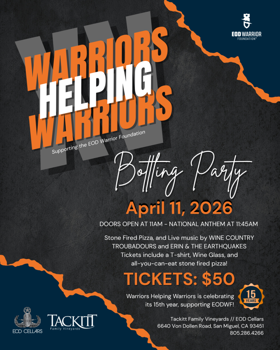 At Tackitt Family Vineyards, we craft small-lot, estate-driven wines that reflect our family heritage, our military roots, and the beautiful land we call home in San Miguel. As a proud veteran-owned winery, we’re dedicated to warm hospitality, meaningful connections, and giving back through our support of the EOD Warrior Foundation.